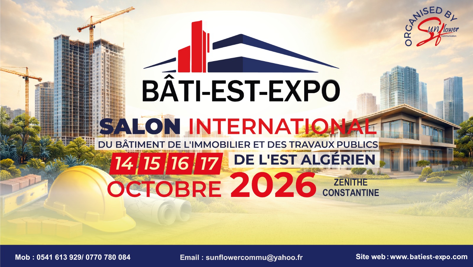 BATI-EST- EXPO est un salon professionnel international dédié aux secteurs Immobilier, Bâtiment et Travaux Publics, organisé annuellement à Constantine, Capitale de l’Est Algérien.